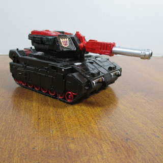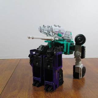 But I can’t quite gush about the figure. It’s good, don’t get me wrong…and getting bots that exceed triple-changers are a rare thing indeed…but there are just enough small flaws for me that I have to knock the figure down to simply “all right” or “okay”. First off, the wings are a little short for my liking. In robot mode, they look fine, but in jet mode they just seem…off. Even with the guns serving as the wingtips as they were designed to it just doesn’t look right to me. Second are Sixshot’s knees. While mine are fine and haven’t really heard of anyone else’s being weak either, the fact that they’re simply friction joints worries me a bit, especially given that for transformation, the knees do need to bend in both directions. Maybe I’ve been listening to too many Third-Party reviews lately on the YouTube, but I’m thinking that this would’ve been the perfect place for some ratcheting joints. Third, with six different modes, I’d have liked it better if there were more places to tab things in. The place this irks me the most is with the anti-aircraft tank mode. The two legs move independently as opposed to being able to be linked in some way. Ultimately this ends up resulting in modes that don’t feel as secure as they did in the G1 counterpart. Fourth, while I’m not crazy about the foil stickers, I gotta say that comparing this to the G1 version, he seems pretty bland and in dire need of some stickers. It looks like the folks over at ReproLabels/ToyHax have this covered though…I just need to break down and order them. Lastly, man do his guns look piddly. They’re as long as their G1 counterparts…but they’re little more than tubes with handles…which I guess is all a gun really is…but still. For display, I typically like to put the two guns together in their Titan Master accommodating mode which gives the toy a more intimidating-looking double-barreled blaster.