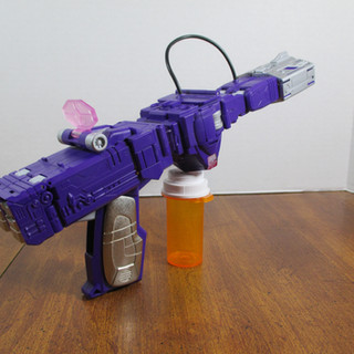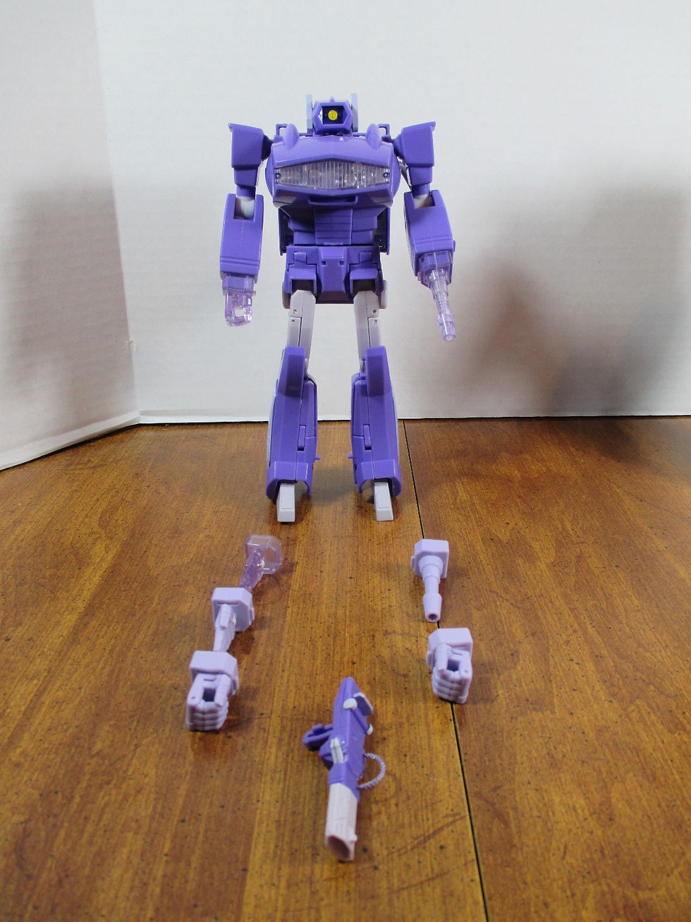 Up next is the Takara version: MP-29 Destron Laserwave. Like Quakewave, the first thing you’re going to notice is the color…but not in a good way. While Takara claims to be sticking closer to the character’s cartoon appearance…well, his coloring in the ‘toon is pretty inconsistent, so they really could’ve gone in any direction they wanted to. They opted to go in a more lilac/lavender direction…which, if I were mean…and I am…I’d say this was your little sister’s Shockwave. Like, seriously, pair him up with a My Little Pony or something. [All right, you got that off your chest…now deep breath and pretend to be a professional again. – Ed.] You mean I can’t say he should be having a tea party with Rainbow Bright and She-Ra? [No. No you cannot. Need I remind you of the Feminist Commandos and Social Justice Warriors that monitor all things internet and raid, pillage and destroy at but a moment’s notice? Just because we haven’t been attacked in a while doesn’t mean they’re gone…it’s just that we’re past due! – Ed.] Point taken. All I’m saying is that a darker purple might have been a better choice. Naturally all your standard Masterpiece articulation is here and his accessories allow you to choose between transparent and solid hands, a separate saluting right hand and, this is pretty neat, a left hand in case Shockers here wants to ditch the ol’ hand-cannon and play a game of basketball or something. There’s even a mini-me version of his gun mode so he can shoot himself…[No. You stop right there. Not another word. – Ed.] He also comes with stickers so you can apply his wandering Decepticon logos (common locations include the top of his chest and forearms). In spite of the color, the appearance of the figure is very much G1 Shockwave with very little in the way of alteration. Takara’s approach to the “wire”…most noticeable in gun mode…is rather unique. Instead of going the way of FansToys, where it’s a plastic hose with wire inside it, MP-29’s is a slinky with a thread down the middle, tied to each end so as to keep the entire thing in shape and avoid any stretching or such. I’d have liked it better if they opted to color it black…but, well, why flog the coloring dead horse yet again? The one thing that Takara really needs to be applauded for is how they handled the backpack. It splits into two pieces…the outer covering serves as a display stand for the gun…and as you can see in the photos, it’s very much needed and welcomed. The other part of the backpack becomes the tip of the gun’s barrel as well as a die-cast support running between the two arms…making that section of the gun pretty solid. Unfortunately, where Takara’s design suffers is in the back end with plenty of gaps and hollowness. Oh, and I forgot to mention, when changing from gun to robot…pulling the head out of the chest can be a rather tricky affair…with many online reviewers actually pulling the head off! I think I’ve found a way around this…just as you feel it starting to catch, but not quite locked into place, don’t continue to pull straight up…instead kind of wiggling from side to side until it finally locks. Doing that, I’ve yet to pop the head off.