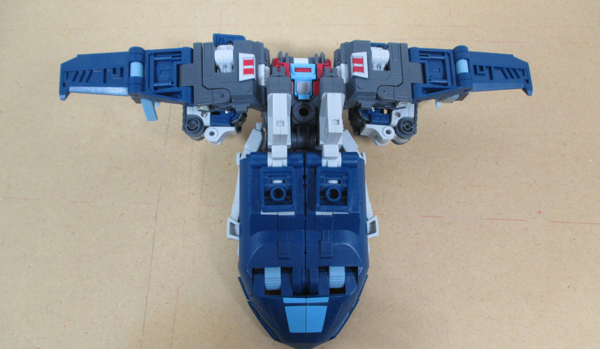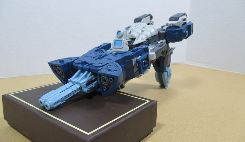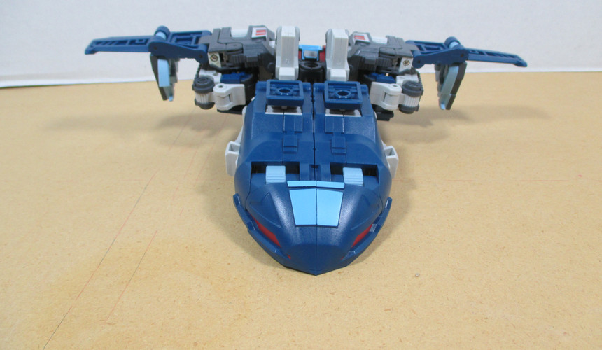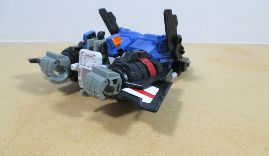 From here, we’re off to jet mode…and I’ve got two versions depicted here. The first is a fan-mode that manages to make the jet a bit more compact and a little more convincing while the second, the official mode, leave the drill hanging off the back as a bit of kibble and the halves of the wolf-ish head sticking up as fins. That second bit isn’t horrible but that first…I just thought was icky. Neither one is terribly solid though, which is kind of a shame since this was one of the better modes for the G1 toy.